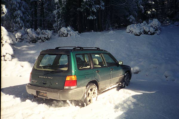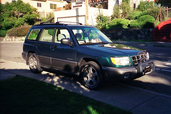 I wanted something with more room for camping gear and the ability to take those dirt roads that the Integra hated. (The Integra has a stiff suspension, good for on-road travel and great for cornering, but it gets alarmingly rough even on graded gravel.) I started looking at station wagons and SUVs, and then someone suggested I consider the Subaru Forester. Suddenly I found myself moving my timetable up, and on 27 Jan 2000, I took delivery of a new 2000 Subaru Forester S. Alas, cruel fate: the 2001 Forester -- really the `2000.5', a mid-year model change that merely happens to be externally visible and hence gets a new model-year designation -- had just been announced, and it comes in blue. I got a green 2000 instead of a blue 2001. (I also missed out on the standard in-dash 6-CD changer, the variable intermittent wipers, and so on.)