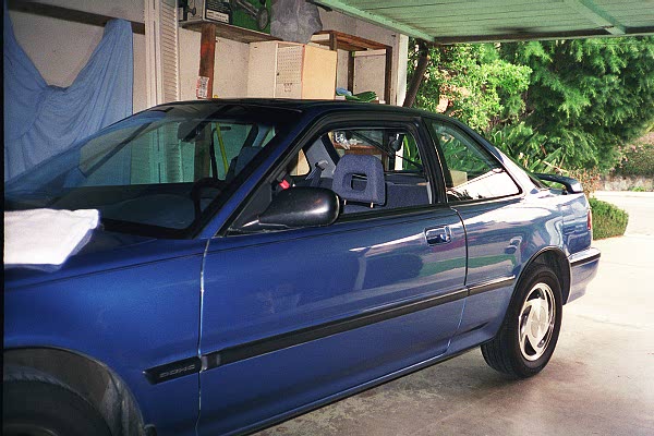 As 1999 drew to a close, I started researching replacements. The Integra still ran well, but had been through an alarming number of ... `incidents'. The driver's side door was nearly sheared off entirely in 1994. I had the car parked and my door open when a little old lady in a 1963 Chevrolet Impala drove into it. The hood and windshield were replaced entirely in 1995 after I cleverly avoided running into a large boxy object on the freeway by swerving off the pavement and rolling the car over entirely. The roof had been crushed in, but as it turned out, was not too badly damaged. The body shop managed to straighten the roof assembly rather than replacing it entirely. Unfortunately, it then developed a slight leak: if parked in the rain, water eventually works its way in. The air conditioner -- which is Freon-based in the 1991 model -- also had a pinhole leak somewhere and would not hold a charge.
