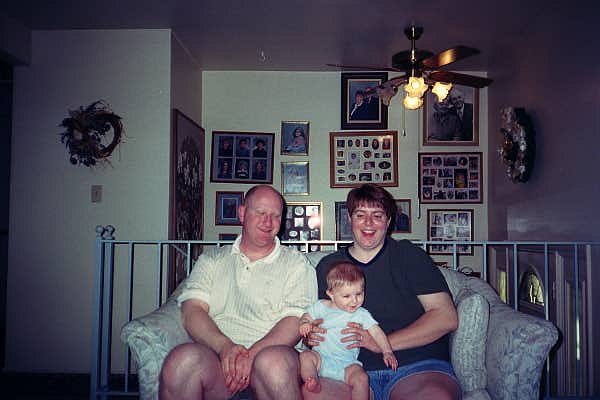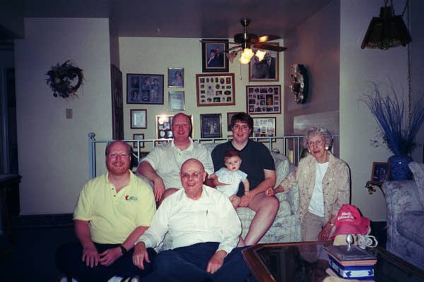 Here is one of Kevin, Becky, and AJ, and me, my dad, and my dad's wife. As you can see from the (same) background as the above picture, these were taken in the same place, at Becky's mother-and-stepdad's place in the Salt Lake City area.