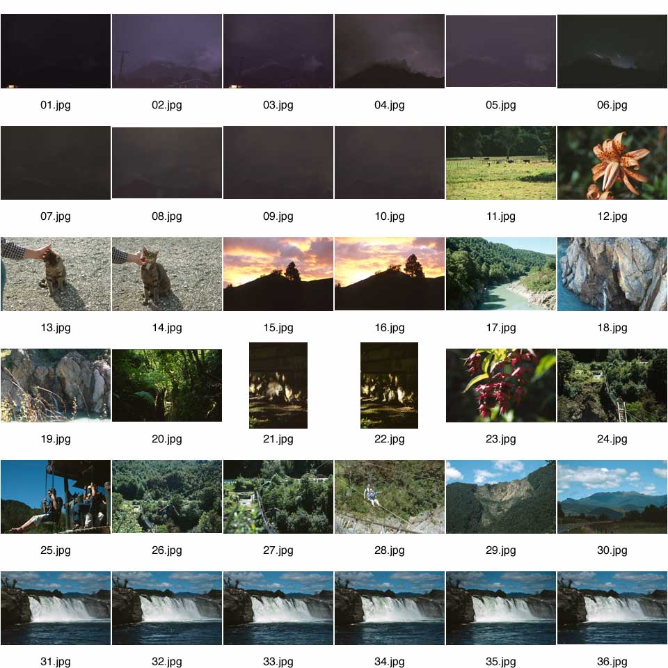Note: frames 1 through 10 were (largely unsuccessful) attempts to photograph lightning in Utah in Sep 2002. (Frames 4 and 6 actually have a little lightning.) Frames 11 through 16 are in Murchison; the motel kitty is named Tammy. Frames 17 through 28 are in Buller Gorge. Numbers 21 and 22 were an attempt at a bird that was hopping about on the path, but all I got was the blur in 21. Frames 29 and 30 are in the nearby area, and 31 through 31 are shots of Maruia Falls (at varying speeds but all froze the waterfall; 33 has water spots on the slide).