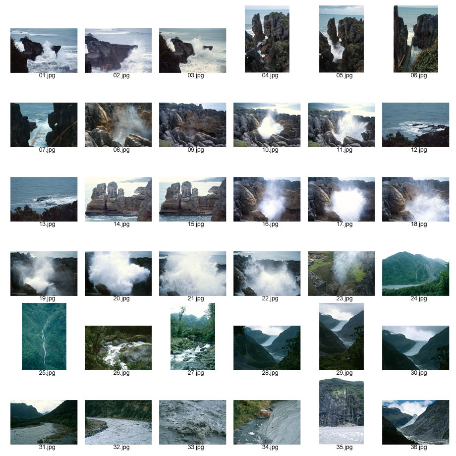 Frames 1 through 23 are at Punakaiki. Here the waves come in hard and make all kinds of interesting spray effects as they come up through holes in the rocks. Frames 19 through 22 (taken in rapid sequence) are particularly impressive.
