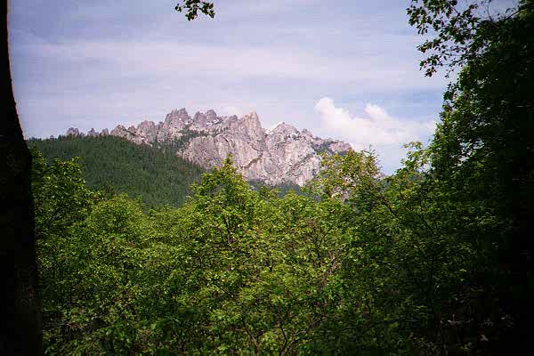 I actually have only this one decent picture of the crags. You can see them from I-5 as you drive just south of Dunsmuir. We -- my parents and I -- stopped there long enough to wander about a bit. It turns out that the park is on both sides of the Interstate. It contains a fizzy-water or mineral-water spring that was bottled for sale down in San Francisco in the late 1800s, but human activity eventually poisoned the spring. (I am typing these notes from memory more than 3 years later, so take this with a grain of salt.)