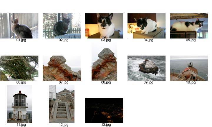 Images 6 through 12 are at the Point Reyes lighthouse. Frame 6 shows some large trees, I think Monterey pines, that have been shaped by the prevailing (and near-constant) wind at the point. Frames 7 and 8 show colorful lichen growing on rather varied rocks. The stuff that looks like concrete is actually Point Reyes Conglomerate, a formation found only at the point. Image 9 is a shot of a rock in the ocean just west of the Point, visible from the steps down to the lighthouse; this rock is often covered with birds (as here) and hence also covered with white stuff (guano). Image 10 shows the new, automated lighthouse, while #11 shows the original one. (Sorry about the slightly crooked horizon. Maybe I should fix that in Photoshop.) In #12, you can get an idea of the climb back up from the lighthouse: the steps are numbered, and there are 308 of them.