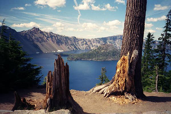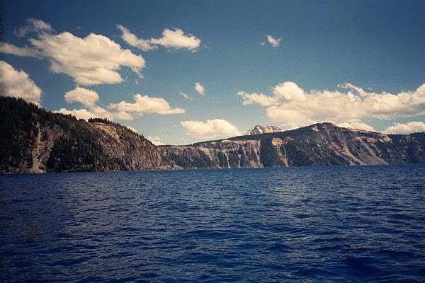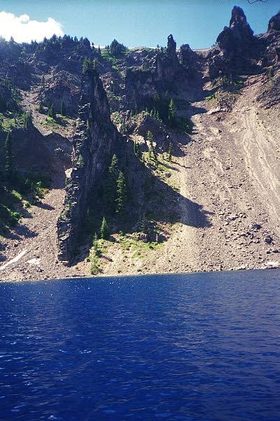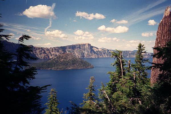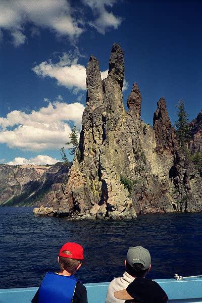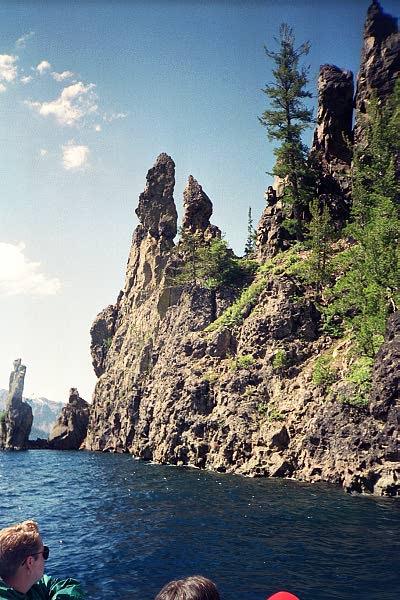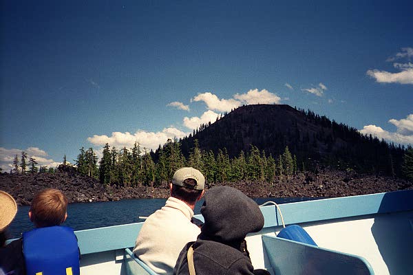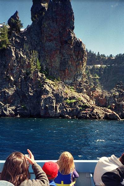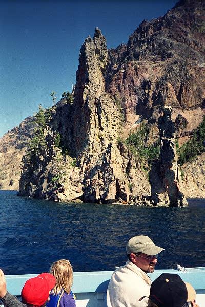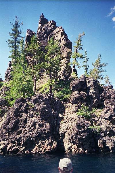 In a far corner (well, ok, the lake is nearly round, so it does not really have corners, but perhaps you get the idea) is a second island called Phantom Rock. The name supposedly has to do with the way the rock appears and disappears depending on where you are on the rim. There is no easy way to get onto this rock, and the boat just runs around it. I took a sequence of photos all the way around, I think; here they are: [1] [2][3] [4] [5]. There was something else special about Phantom Rock, but I have forgotten it already.