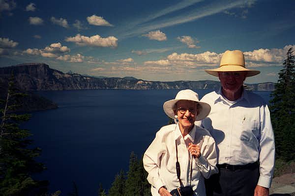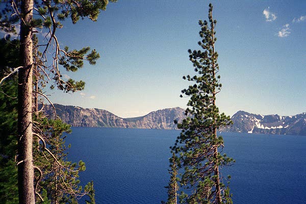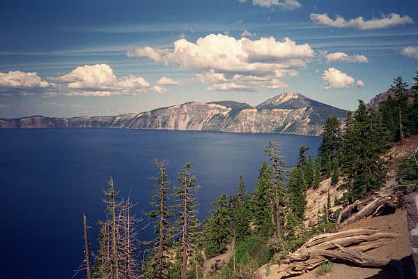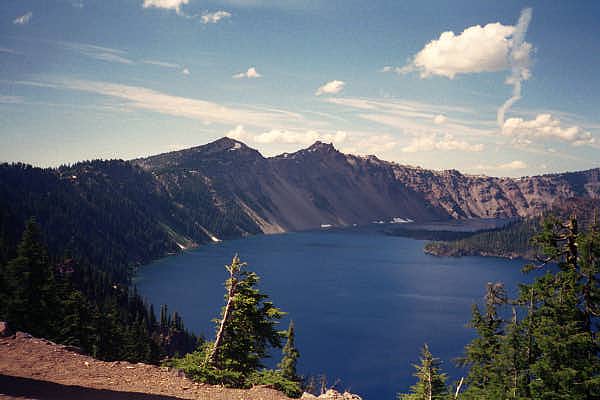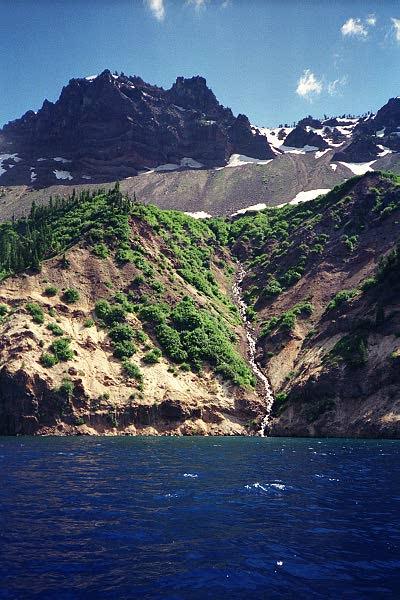 Crater Lake is actually the remains of an old volcano (Mount Mazama) that blew its top. The caldera filled with water and is now an incredibly deep freshwater lake -- the deepest in the US, and the seventh deepest in the world, 1958 feet deep. It is also quite high up -- the surface of the lake is nearly 6000 ft above sea level, and the rim is around 7000 ft ASL.