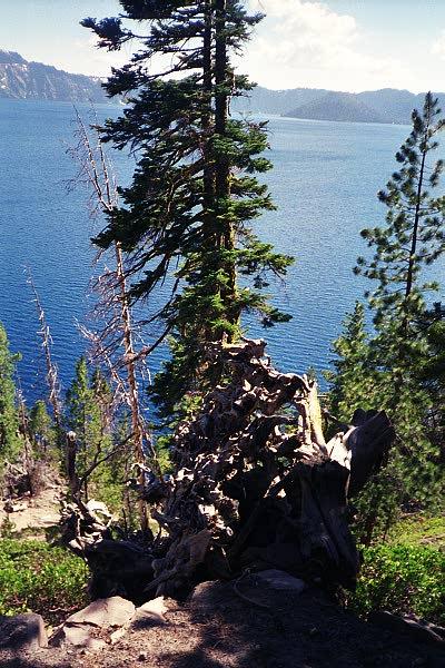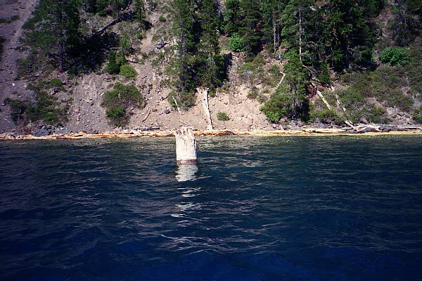 There are trees growing in the crater walls. What happens when one dies, or topples in a storm? The answer is: it floats around in the lake for a long time. If it has a root ball attached, it can float vertically!