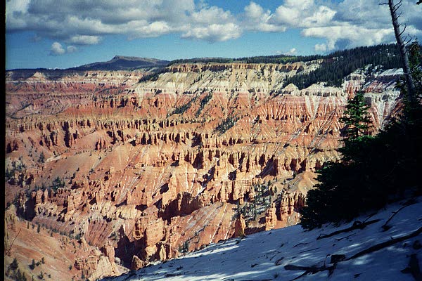 Unlike Zion (a true canyon) but like Bryce `Canyon', Cedar Breaks is really an amphitheater -- a semi-circular cliff that falls away in a slope. In this case the slope is quite steep and the bottom is very far down. Unlike Bryce, there are no paths from the rim to the bottom. (It is possible to hike up to the bottom from the other direction, though.) The colors are the result of minerals in the rocks, and they change with the sunlight. I took 14 pictures, all from different points and at different times; rather than making one huge page with them all, I have broken them into several pages with several images each, based on the point from which I took them.
