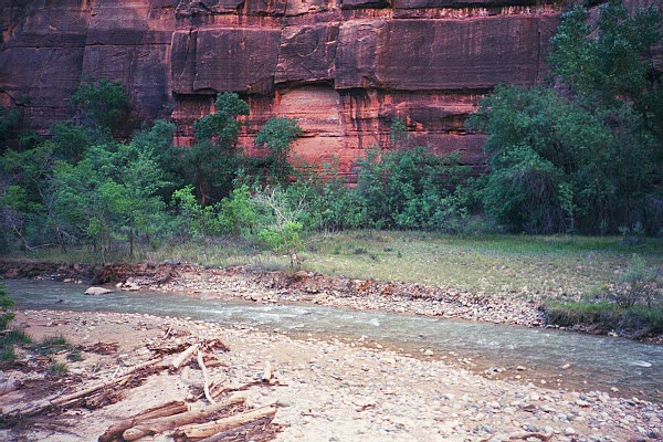 Here the river runs close to the base of sheer cliffs. As always, ``available light isn't'', but these dark shots came out pretty good anyway, in a sort of cheesy ``artsy'' fashion. |